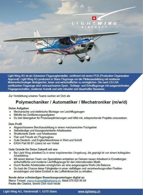 Die Lightwing AG ist ein zertifizierter Schweizer Herstellungsbetrieb nach Part 21.