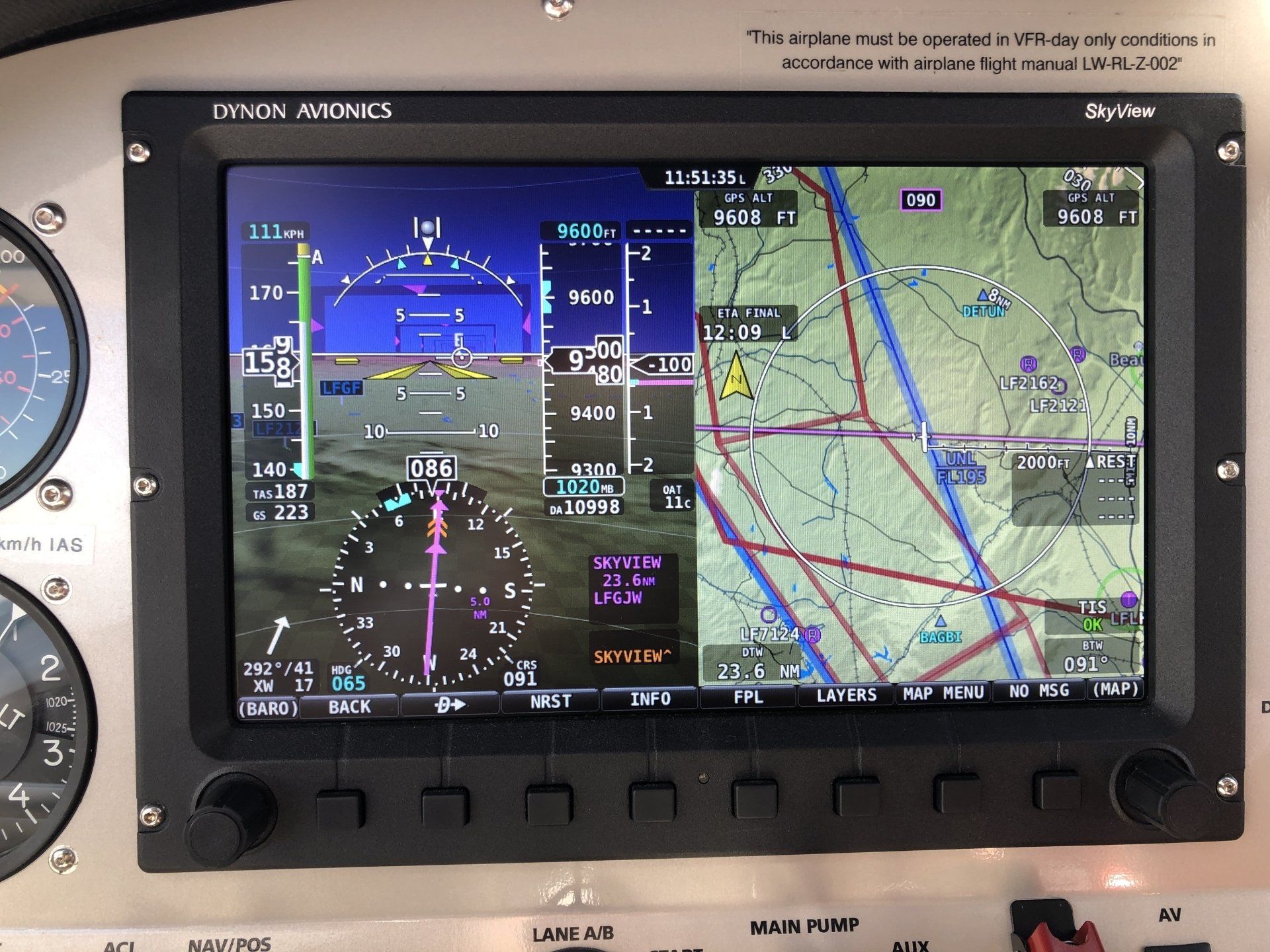 We covered the 430 NM with constantly increasing headwind in 5:20 hrs. For the return flight we only needed 4:50 hrs on FL095 with a pleasantly supporting tailwind. With the Dynon Skyview and tabletdock it was easy to recognize and fly around the many control and restricted zones.»